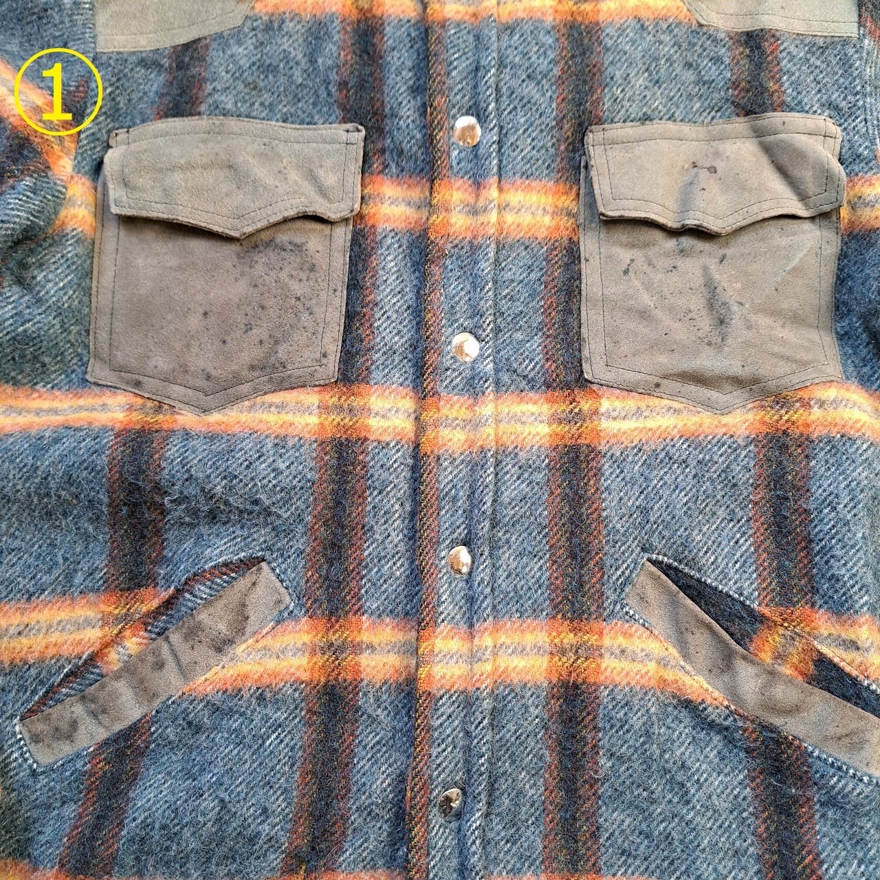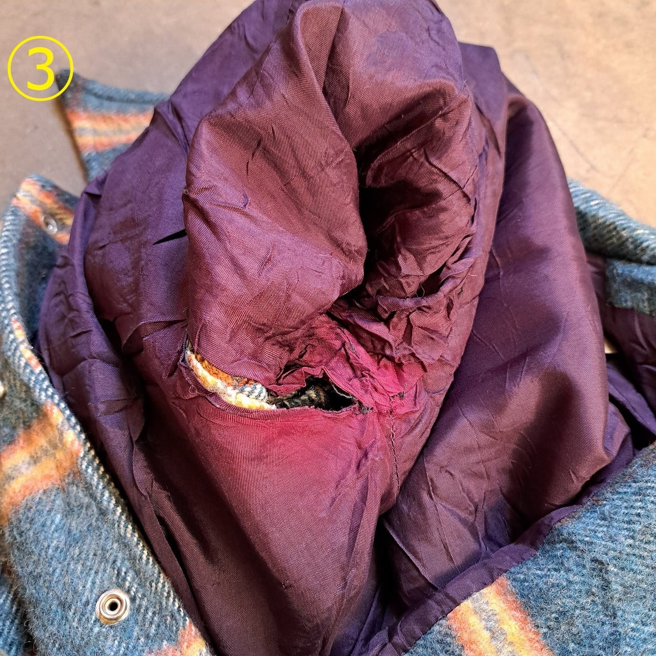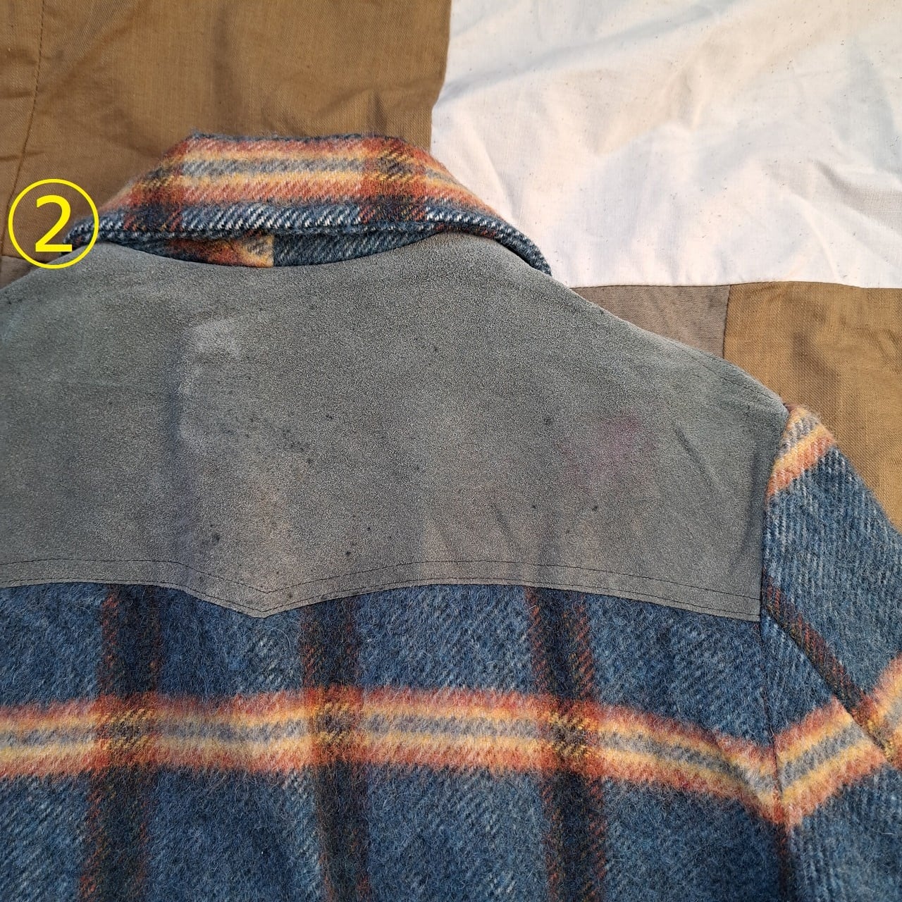●状態:①レザー部分シミあり。②レザー部分シミ、移染あり。③右袖内側ダメージあり。