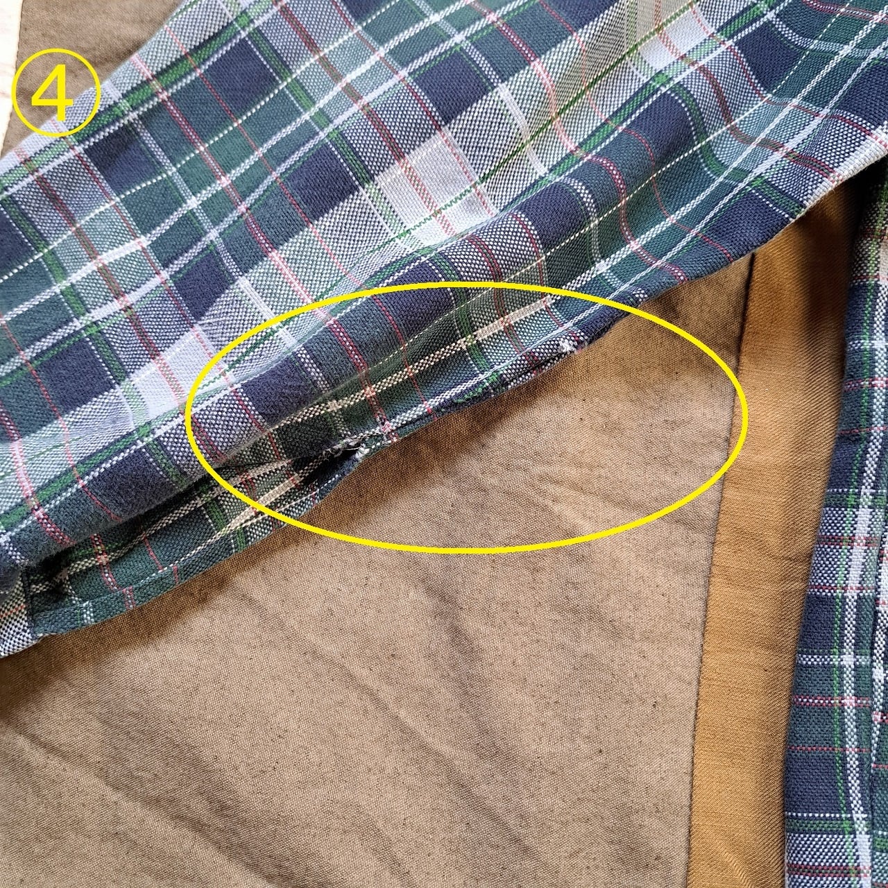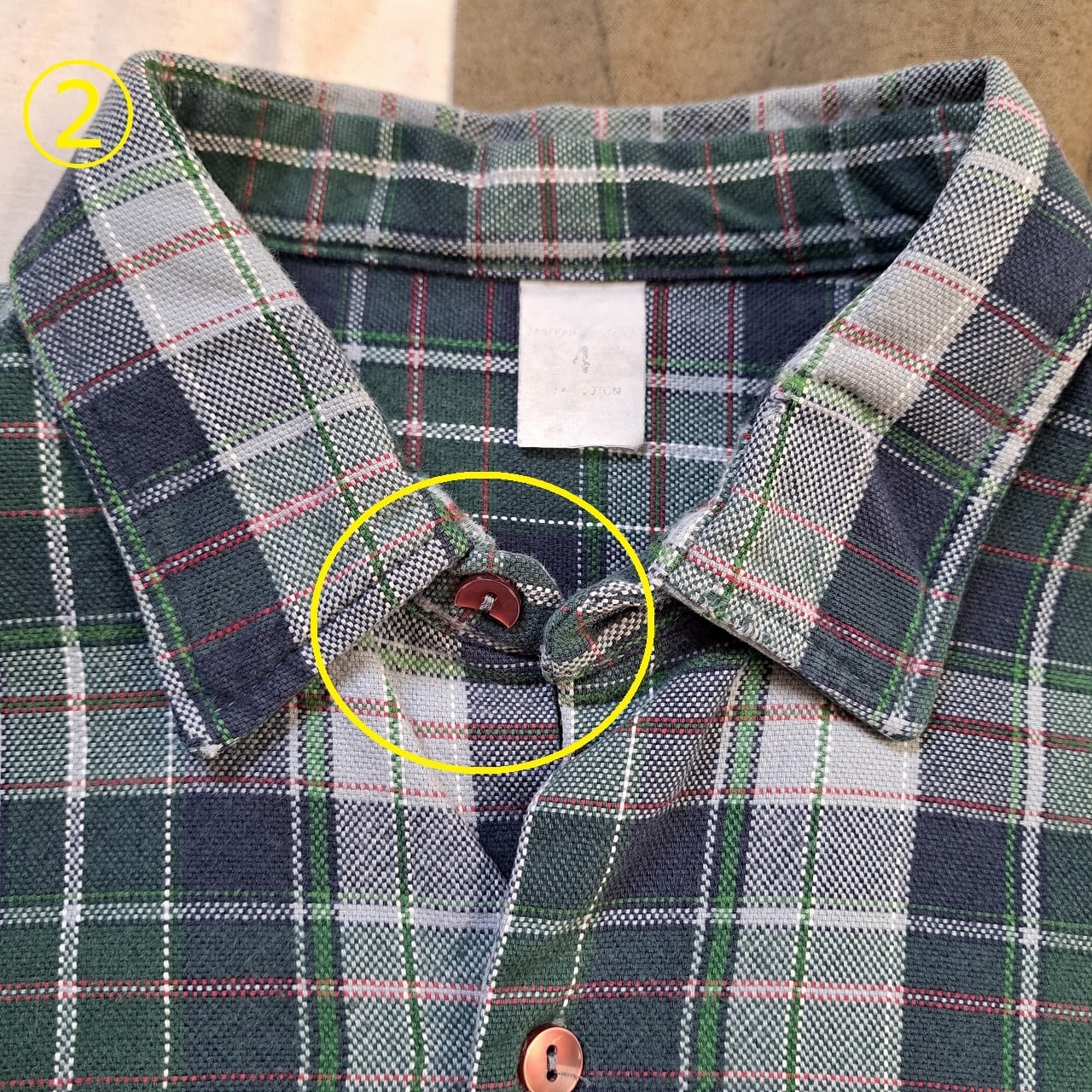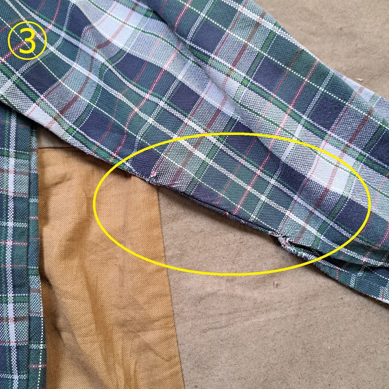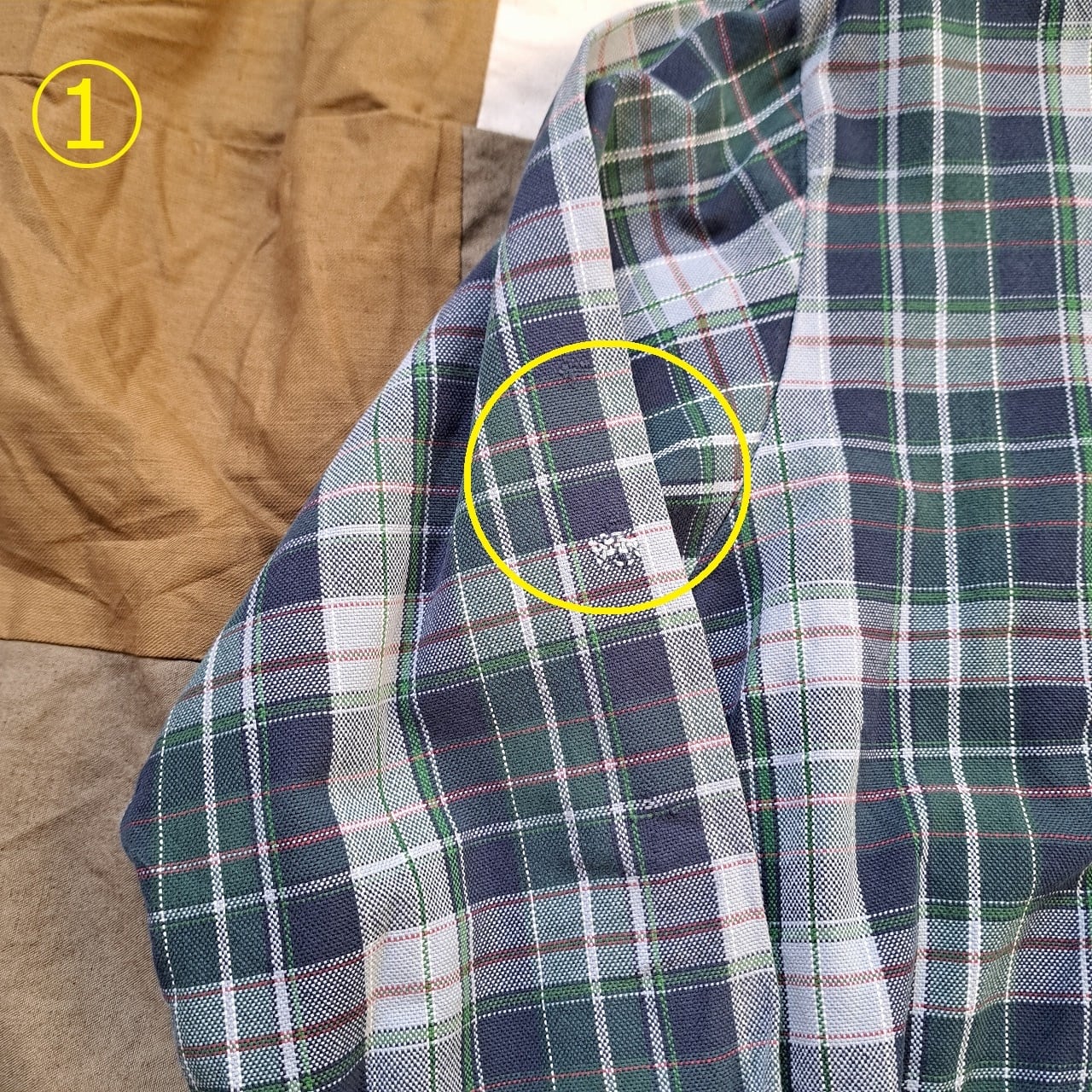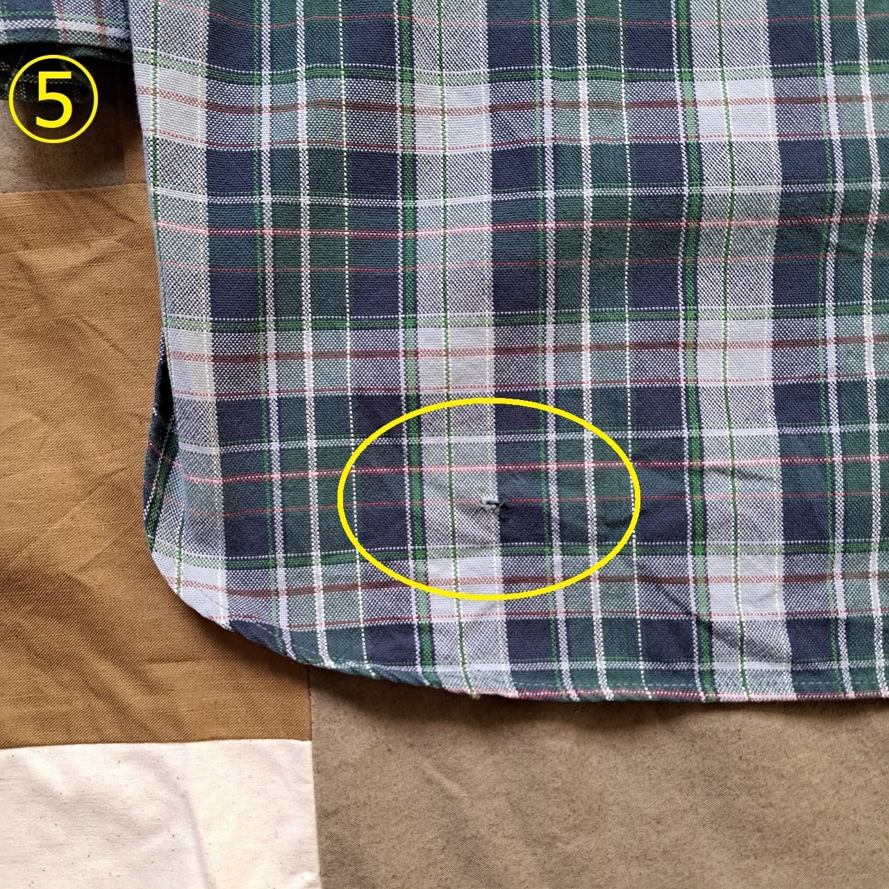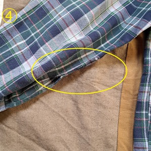 ●状態:①右袖リペアあり。②トップボタン欠けあり。③左袖内側擦れあり。④右袖内側擦れあり。⑤後ろ裾ダメージあり。