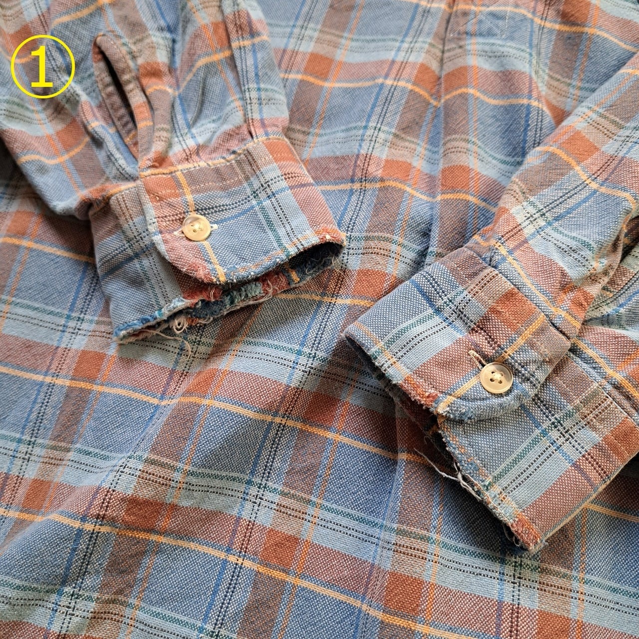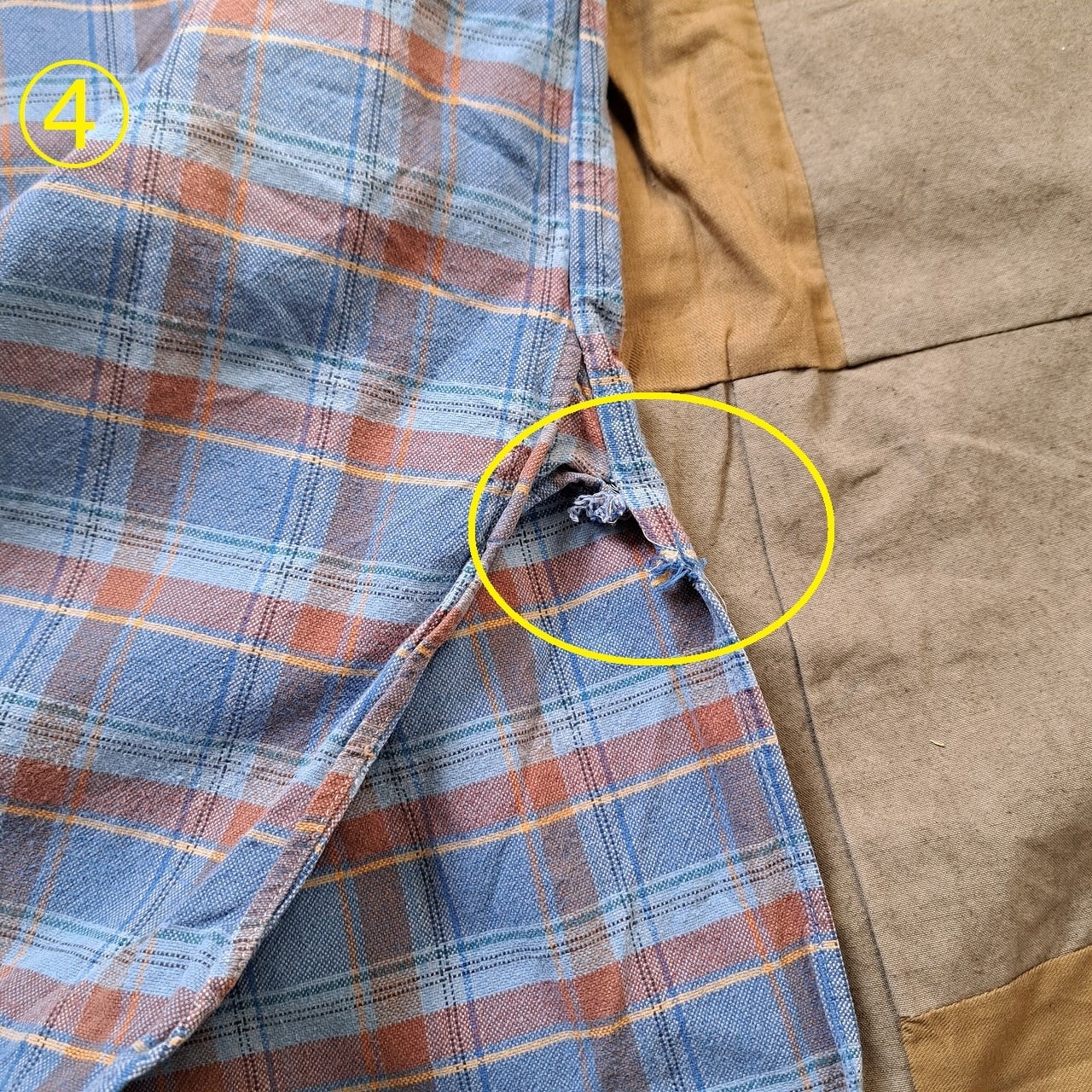 ●状態:①両袖口擦れあり。②右袖、右胸ペンキ飛びあり。③左胸ペンキ飛びあり。④左わきマチ擦れあり。⑤右わきマチ擦れあり。