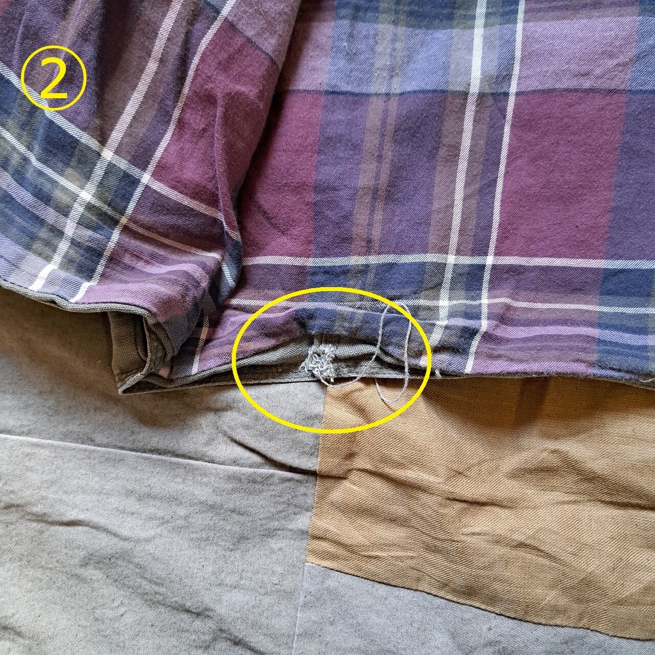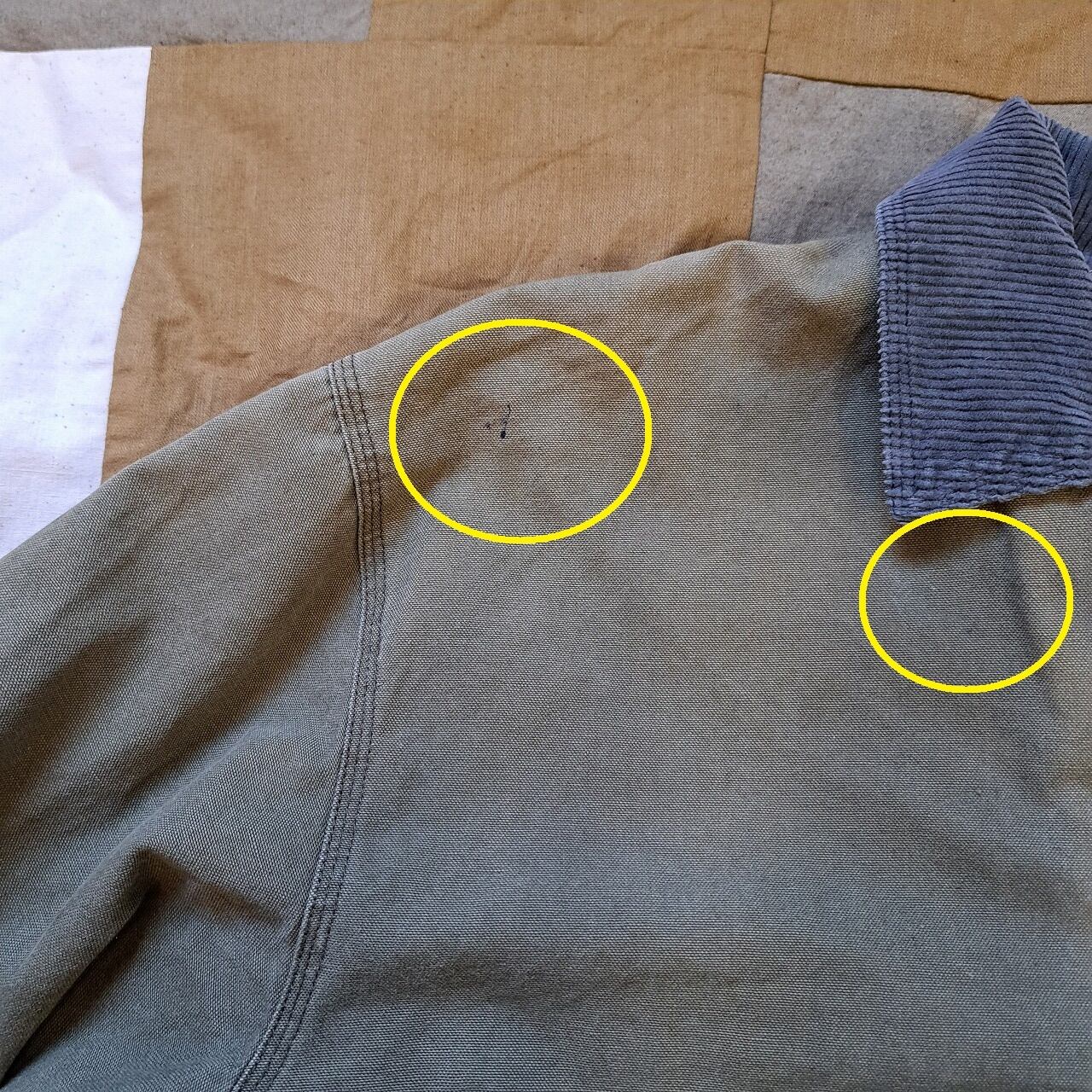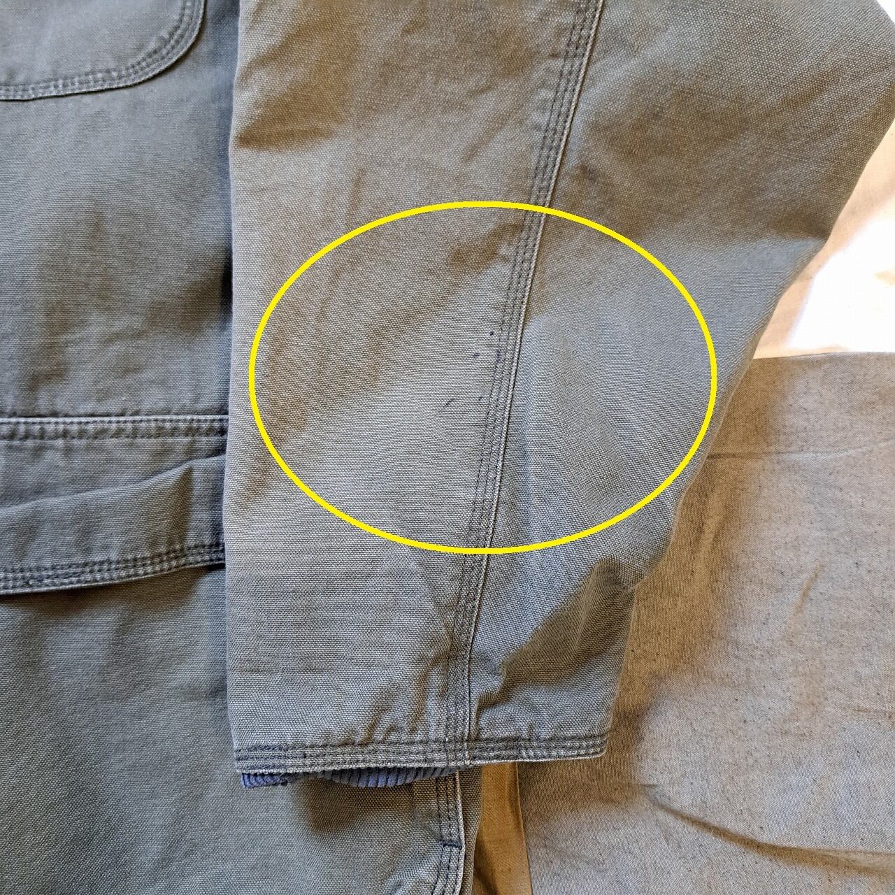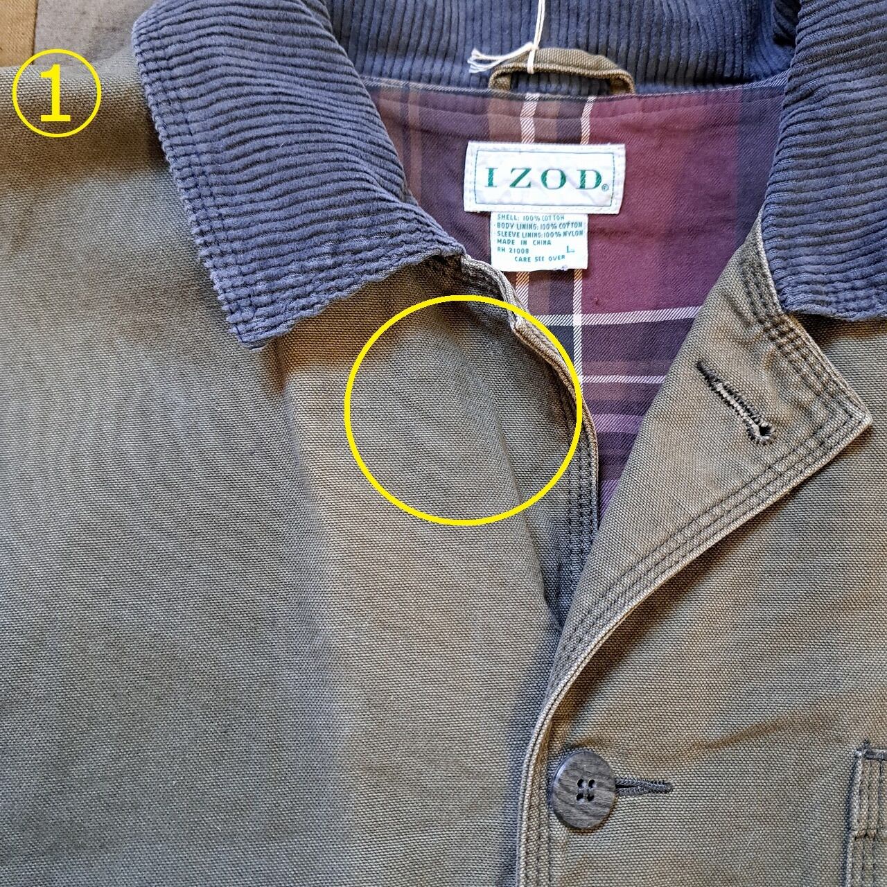 ●状態:全体的に日焼けあり。随所に黒い汚れあり。①第一ボタン欠損。②裏裾付近ダメージあり。