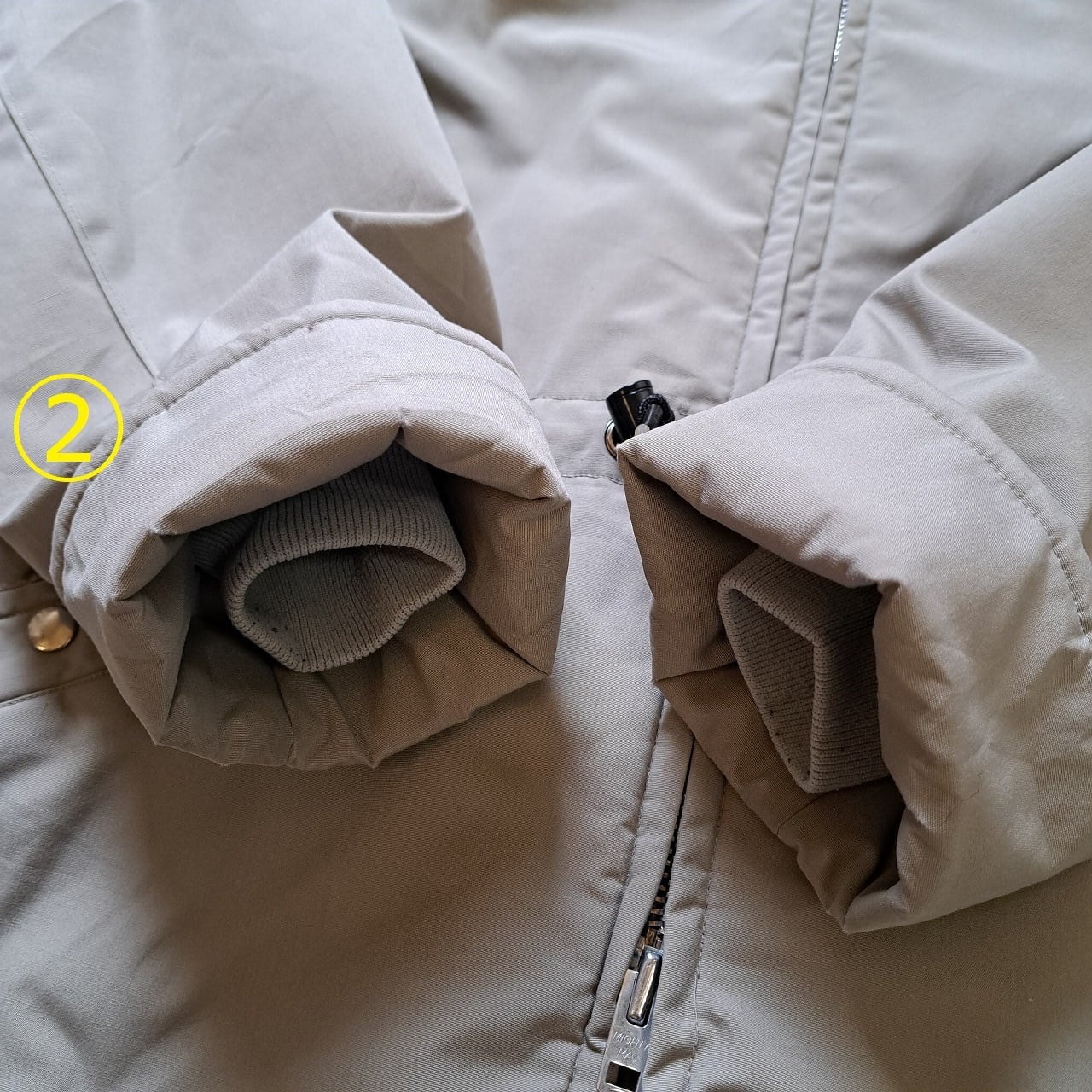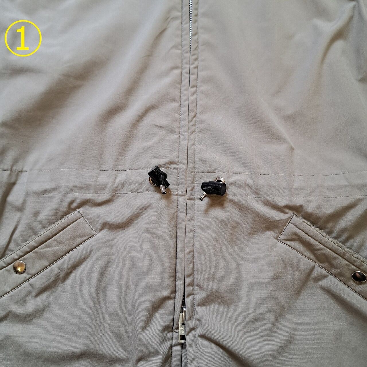 ●状態:①腰スピンドルコード部分ステッチ抜けあり。②両袖口擦れあり。