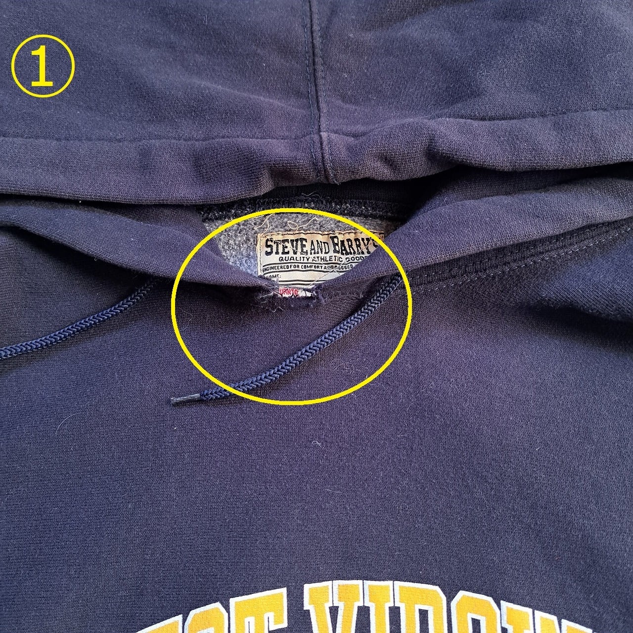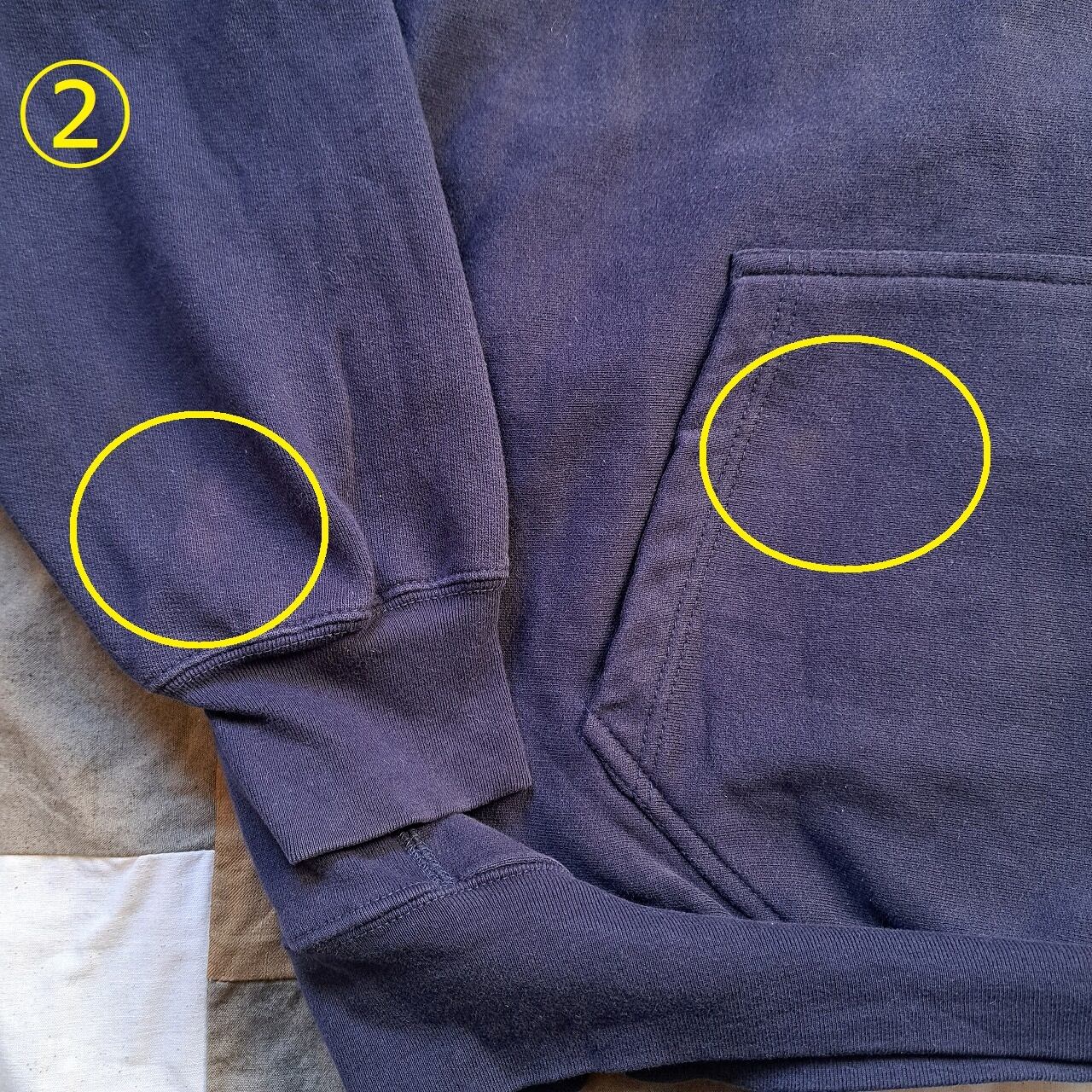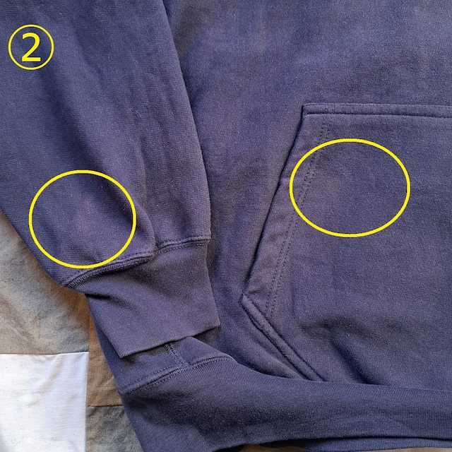 ●状態:①首元ほつれあり。②右袖、前ポケット汚れあり。