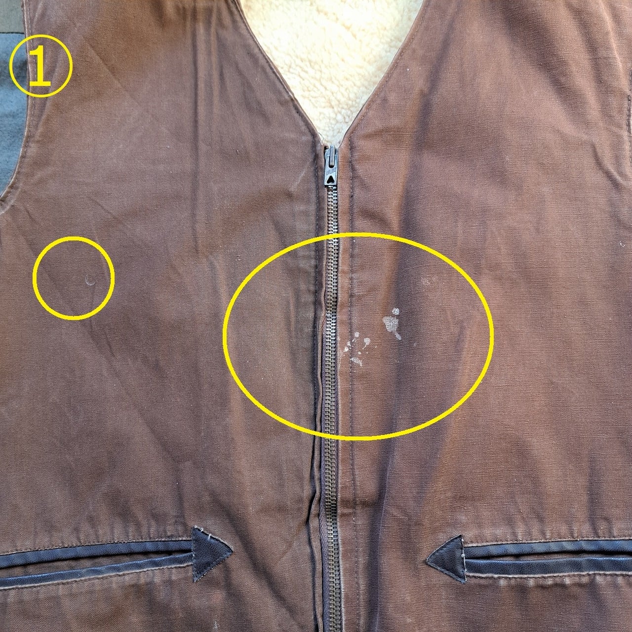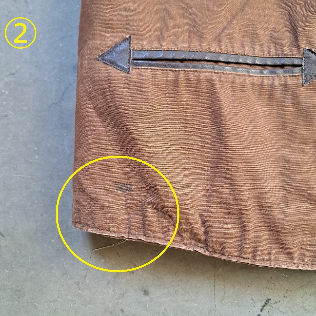 ●状態:背面上部色抜け、汚れあり。①前身頃色抜け、汚れあり。②右前裾付近汚れあり。