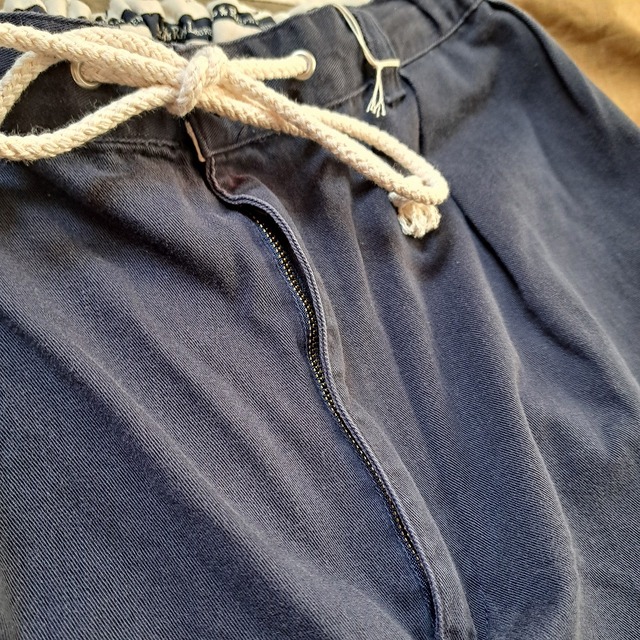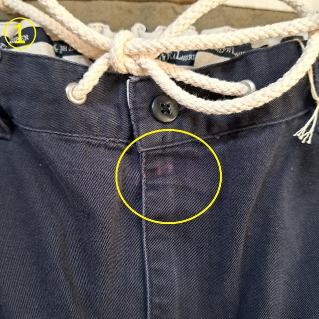 ●状態:ウエスト部分ゴム&紐追加。①トップボタン下色抜けあり。