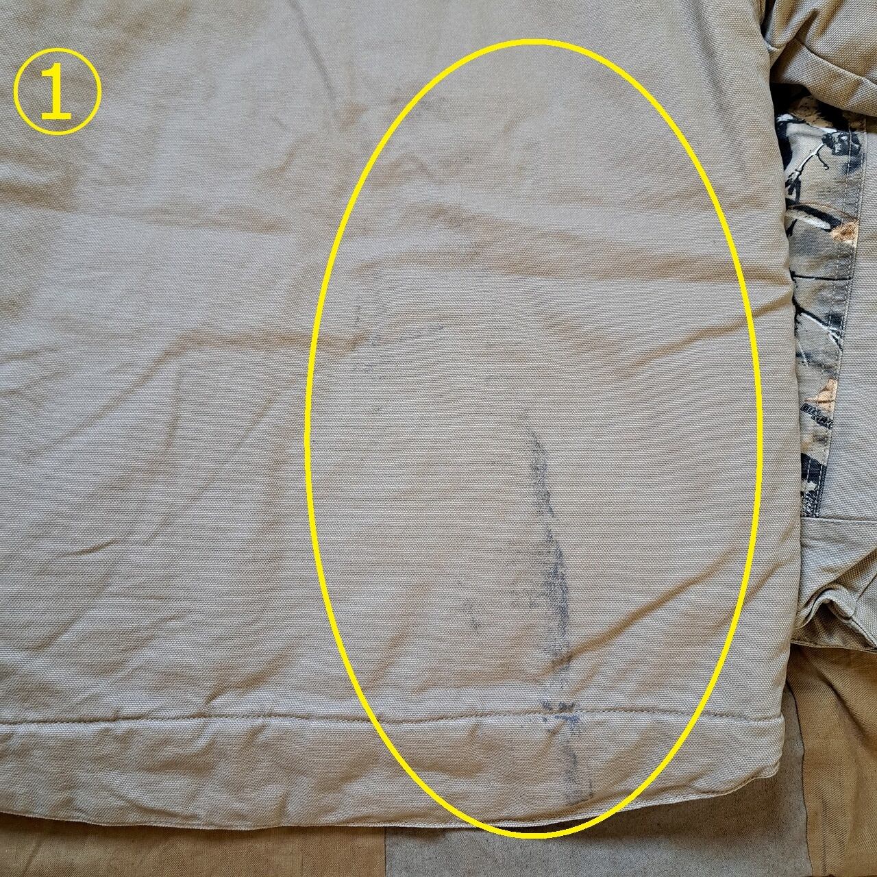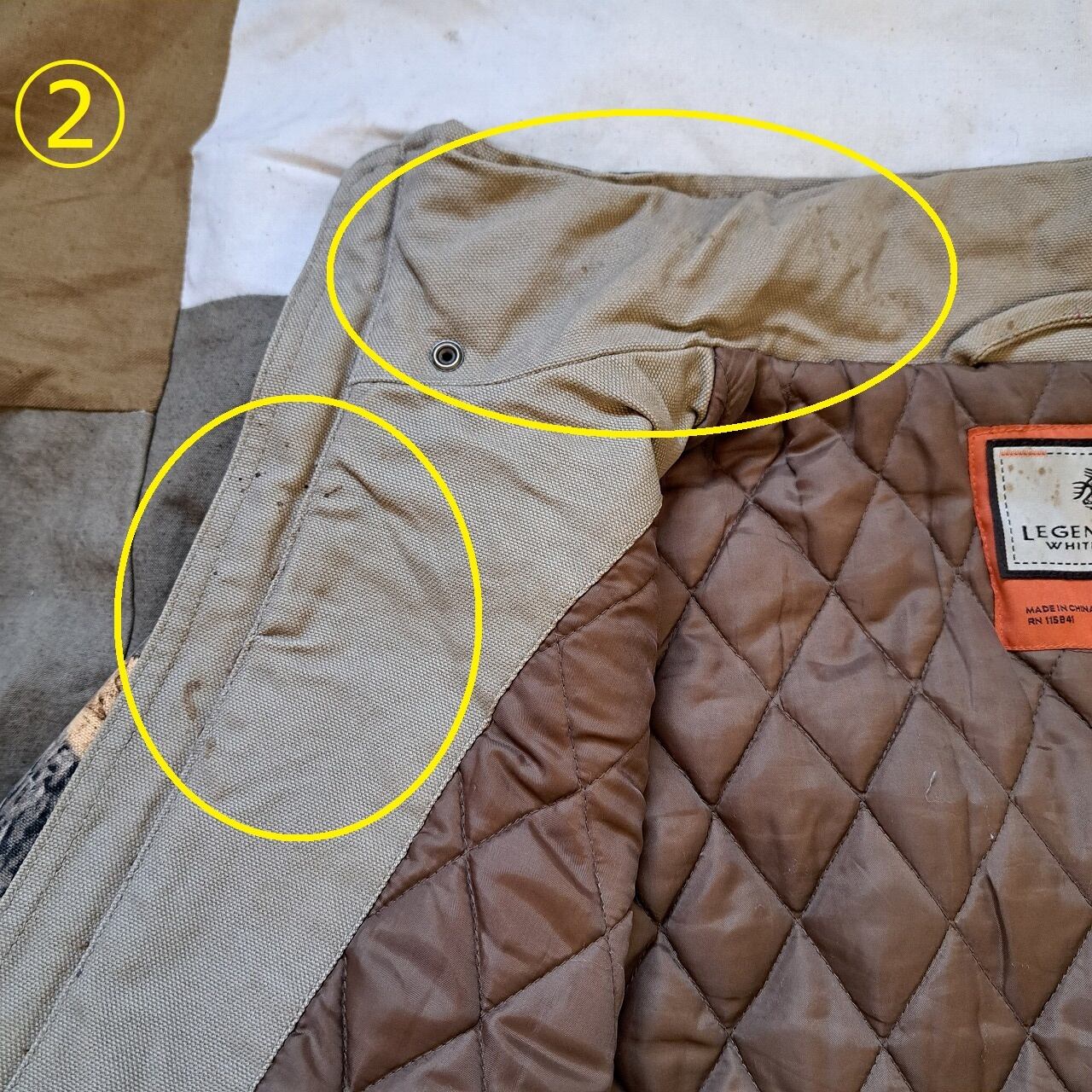 ●状態:フード欠損。①背面汚れあり。②内側汚れあり。