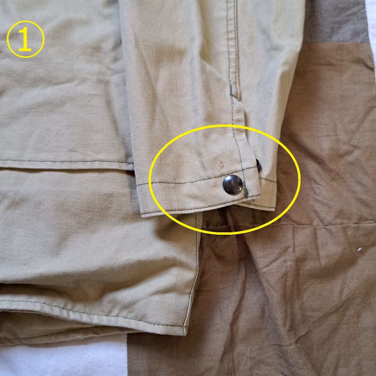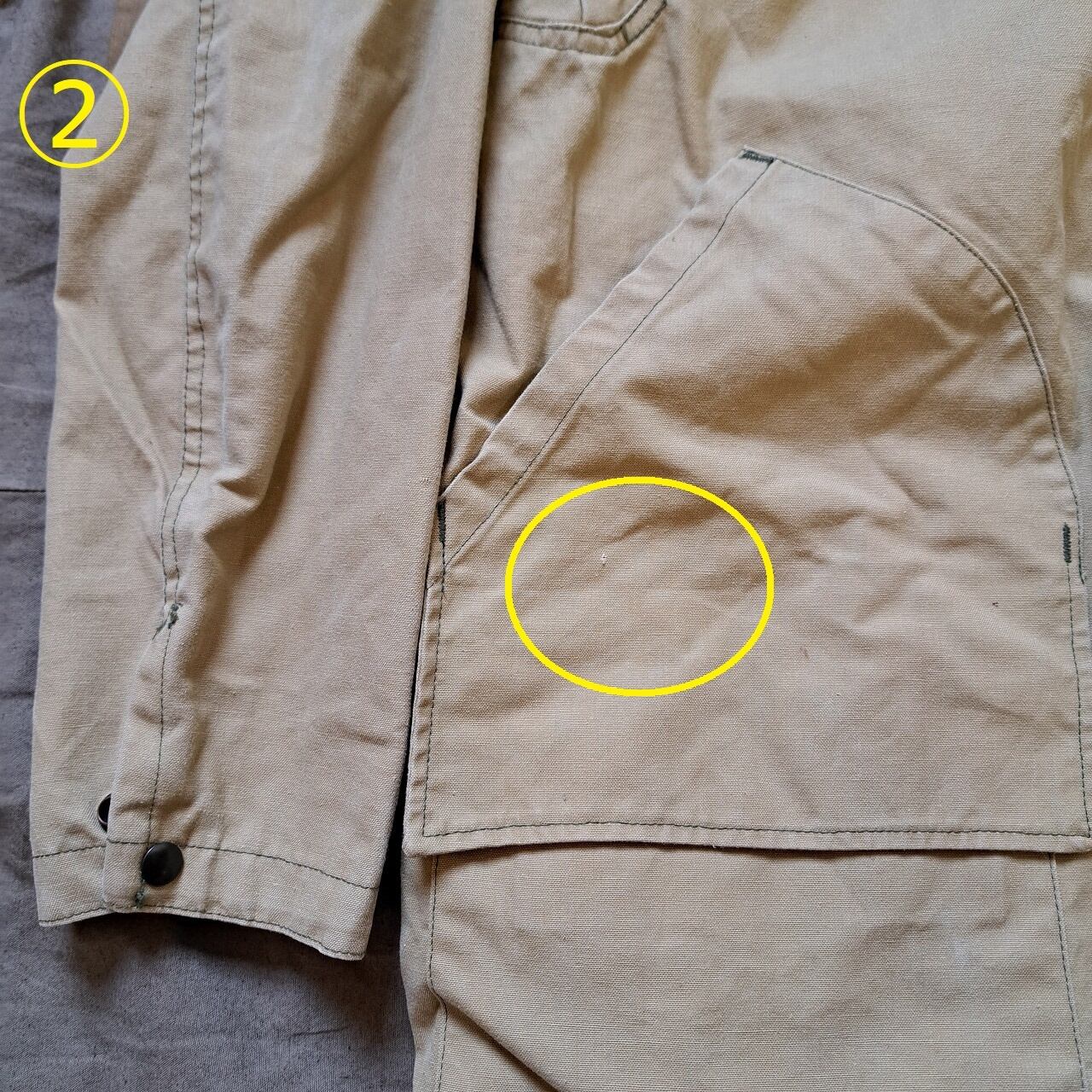 ●状態:①左袖口汚れあり。②右前身頃汚れあり。そのほか、各所に細かな汚れあり。