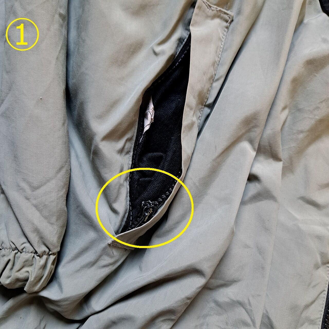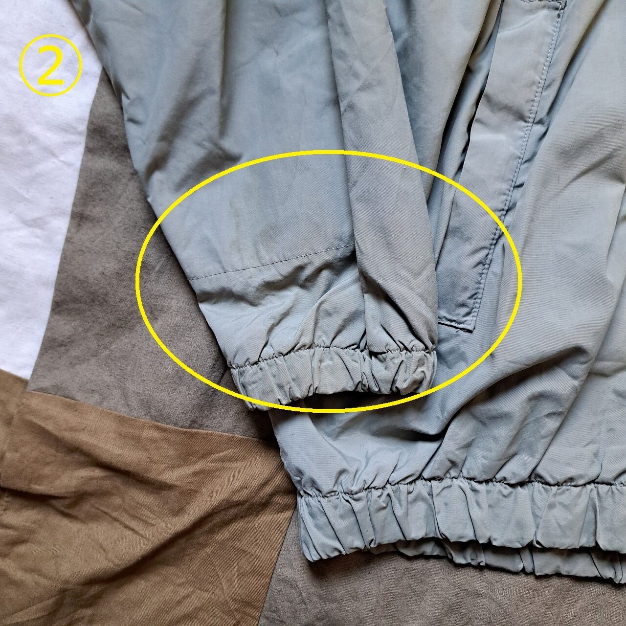 ●状態:細かな汚れ随所あり。①右ポケットジップ破損。②右袖汚れあり。