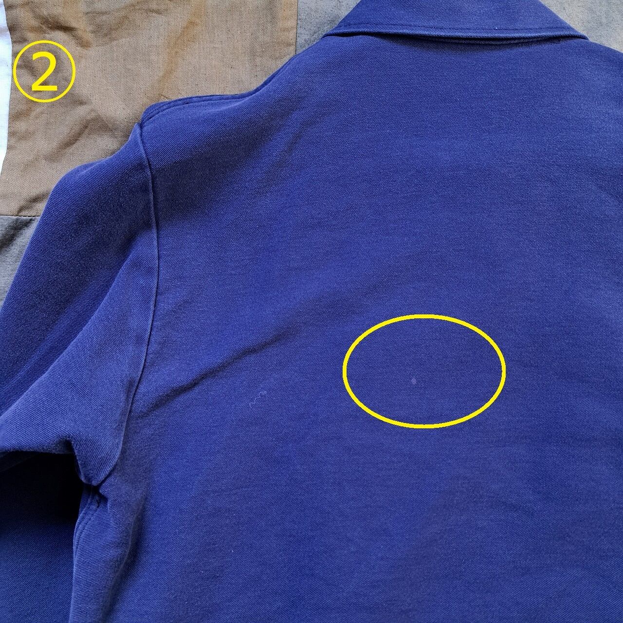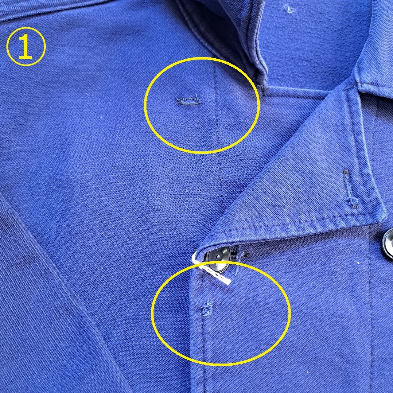●状態:①トップボタン欠損。第2ボタン付近ダメージあり。②後ろ身頃色抜けあり。