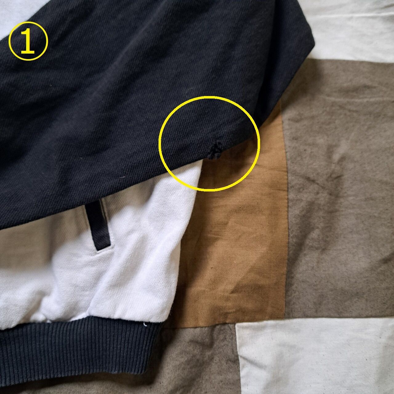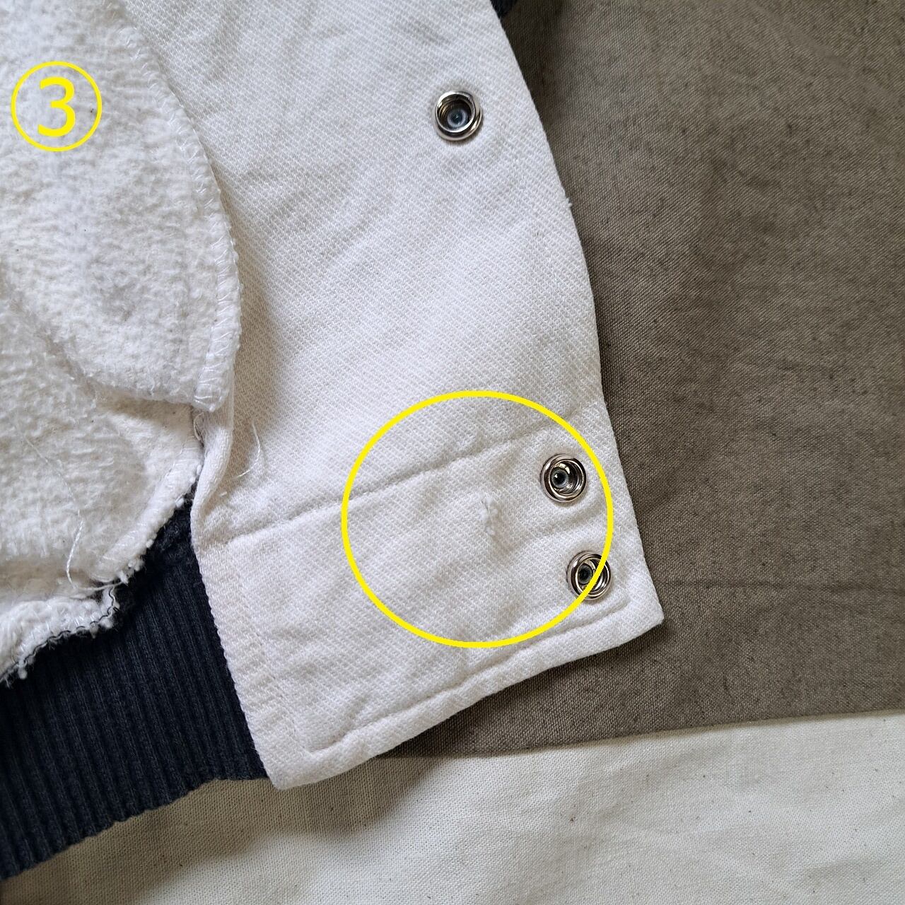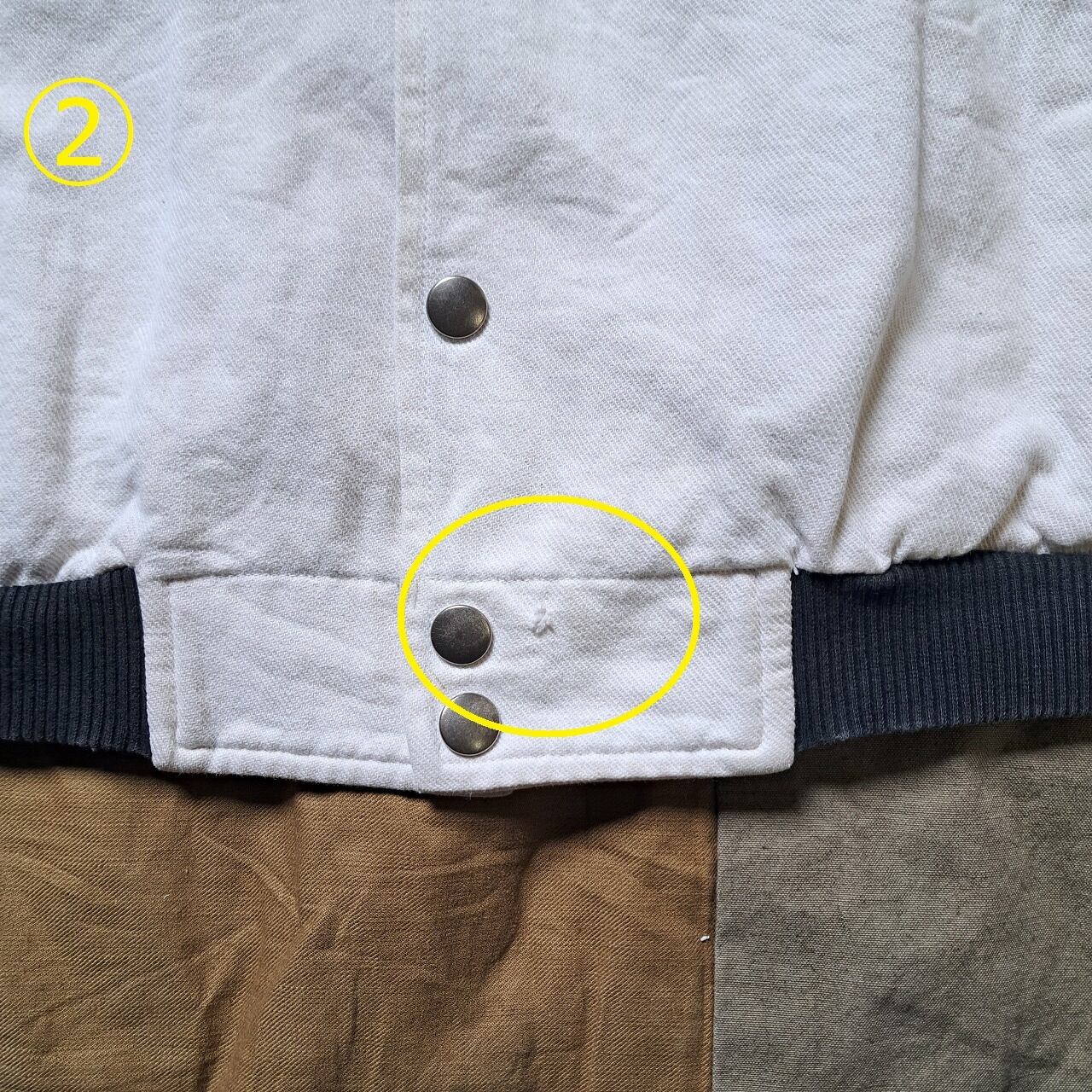 ●状態:①左袖ダメージあり。②前裾付近ダメージあり。③前裾付近内側ダメージあり。