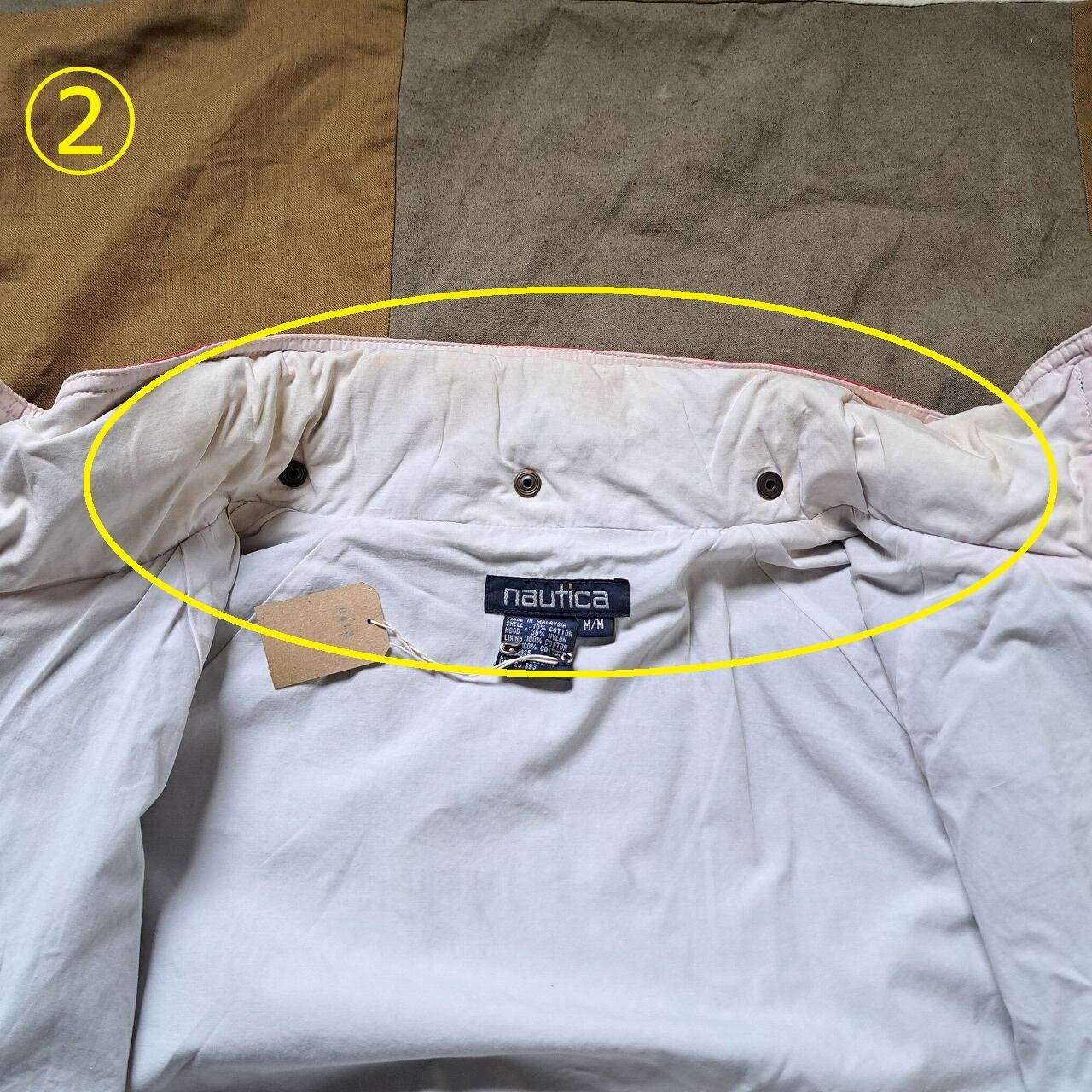 ●状態:①前立て付近、内側汚れあり。②襟裏汚れあり。