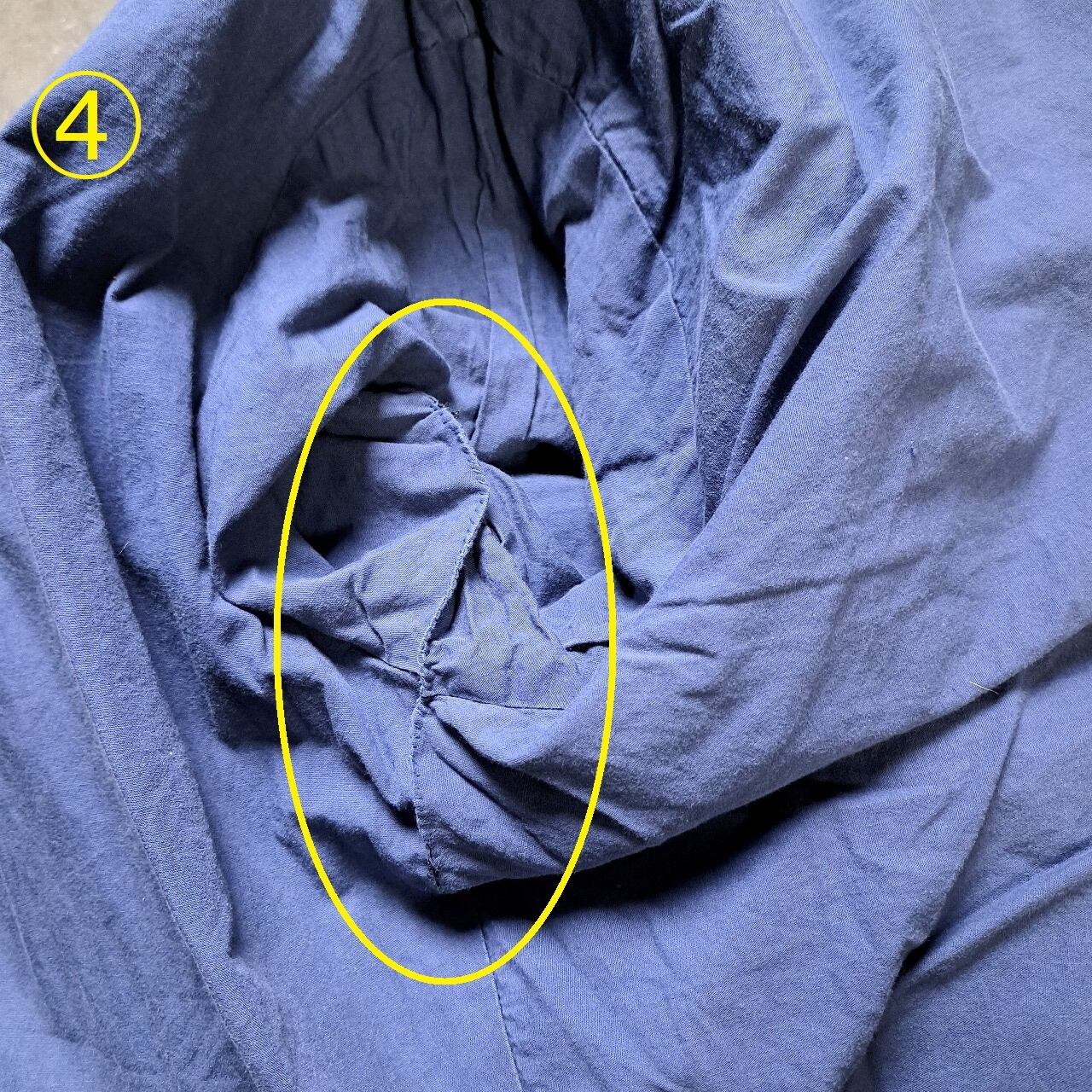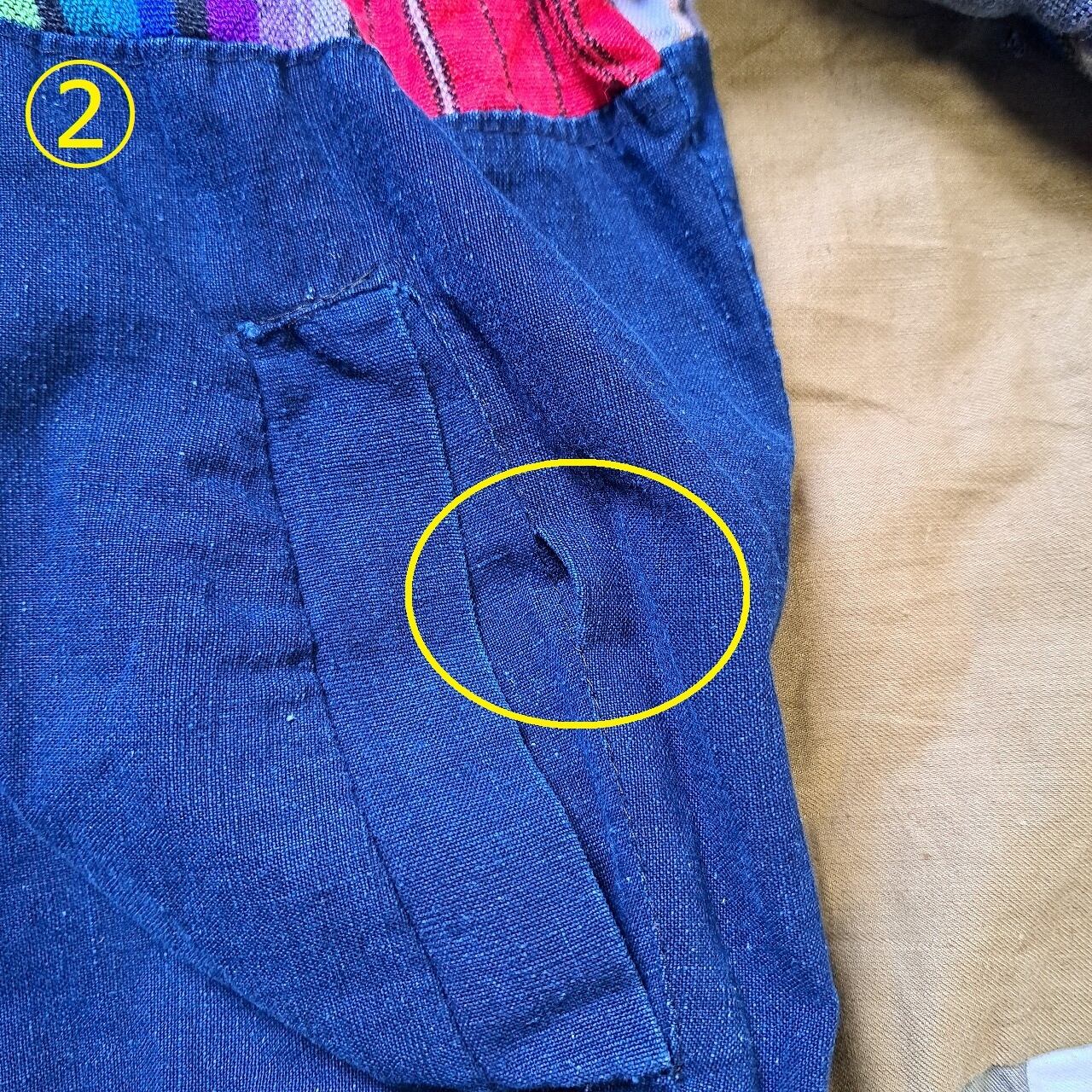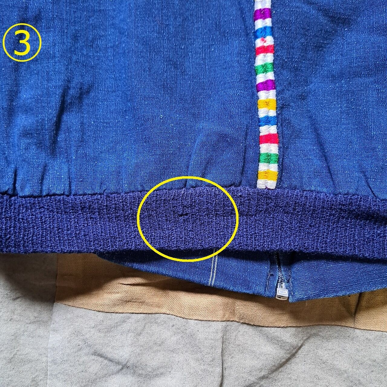 ●状態:①右前身頃リペアあり。②左ポケット初期縫い飛びあり。③後ろ裾リブダメージあり。④右わき内側リペアあり。