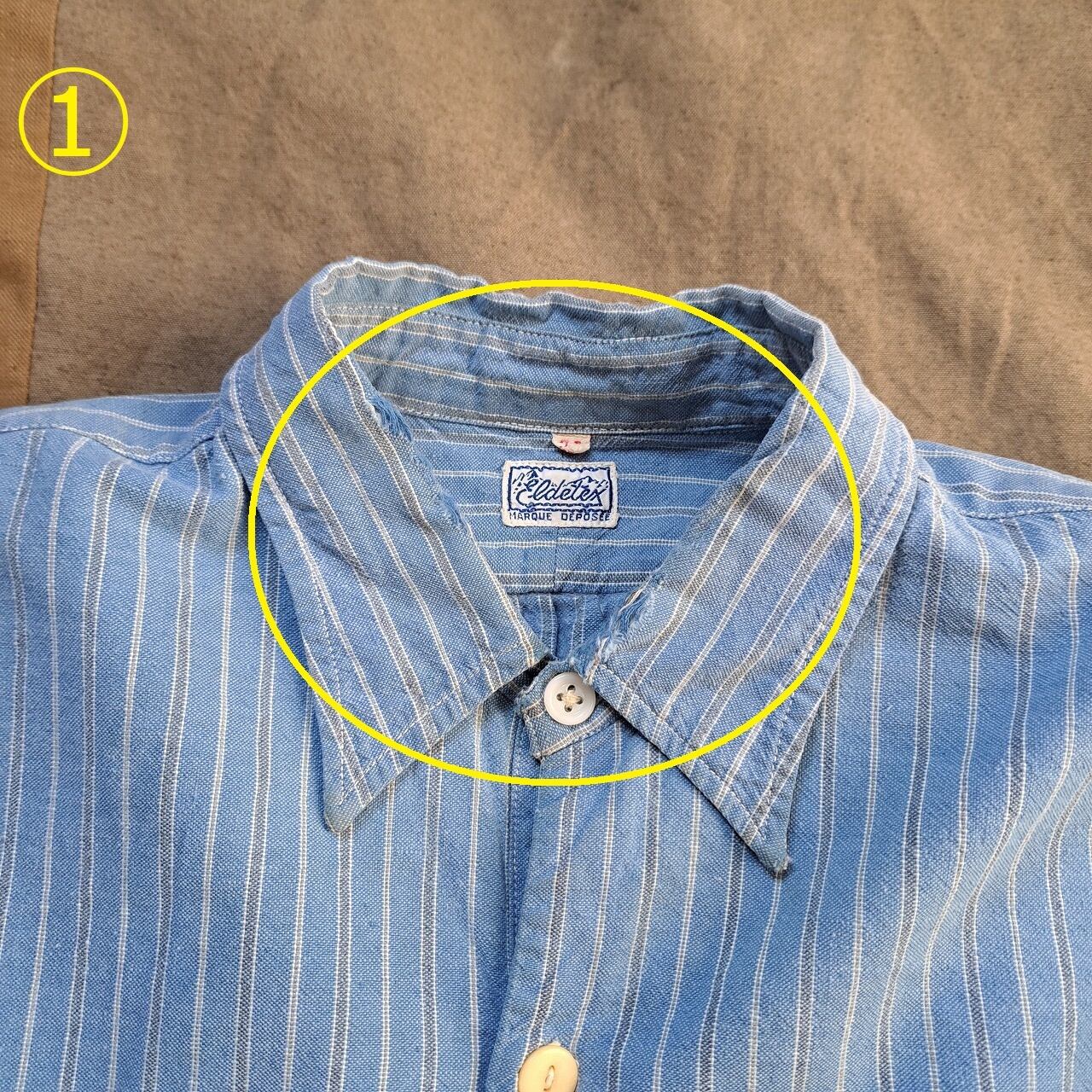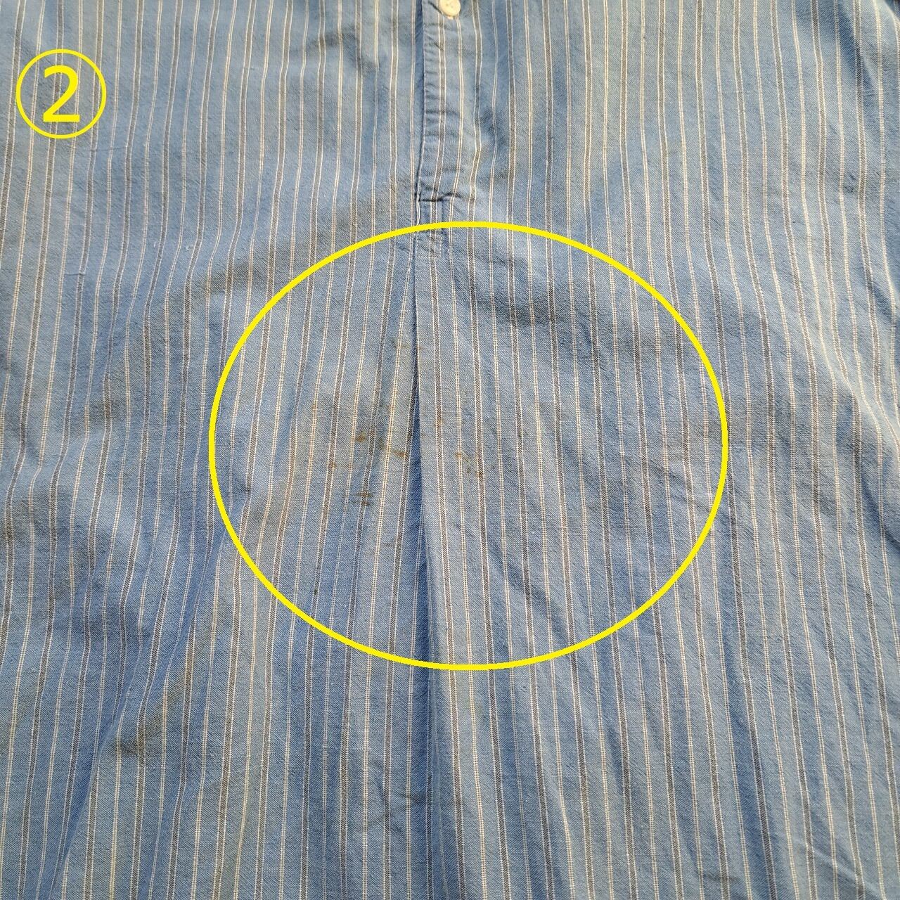 ●状態:両袖口リペアあり。①襟ダメージあり。②前身頃シミあり。
