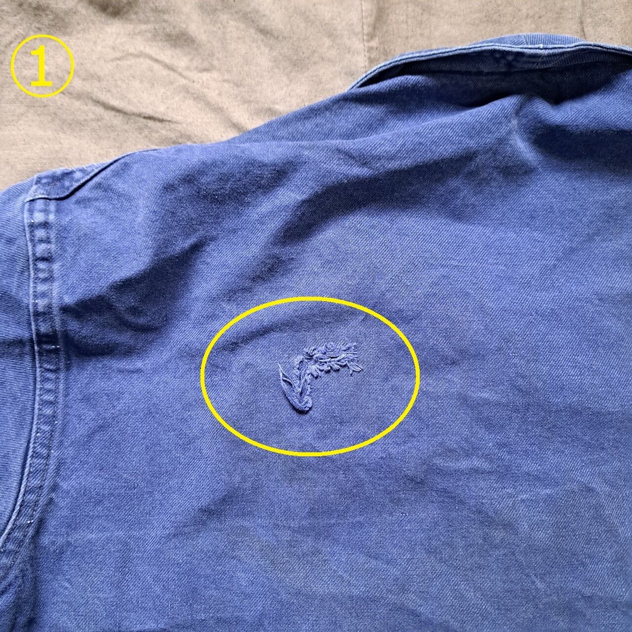 ●状態:随所に汚れあり。①左肩甲骨付近リペアあり。②左前裾ダメージあり。