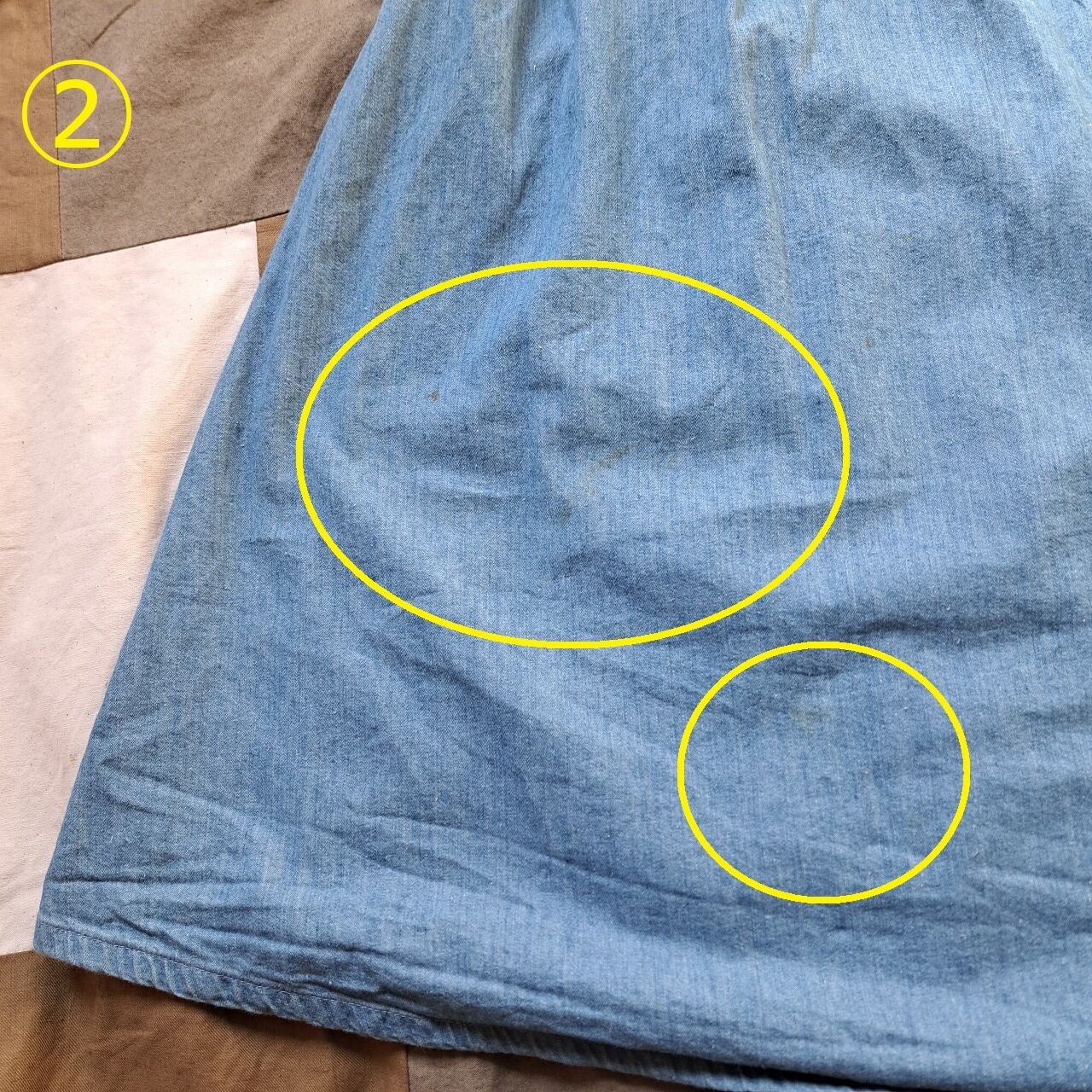 ●状態:①左前身頃シミあり。②右前身頃シミあり。