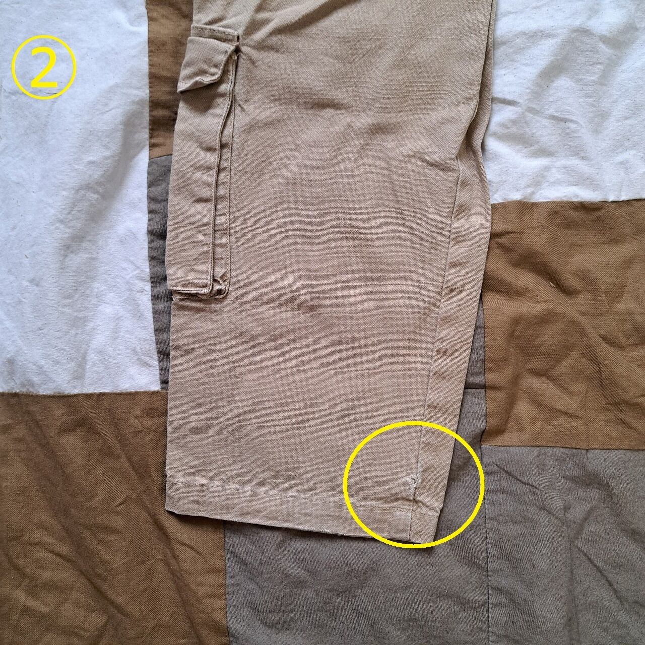 ●状態:①左もも横ダメージあり。②左後ろ内側裾ダメージあり。