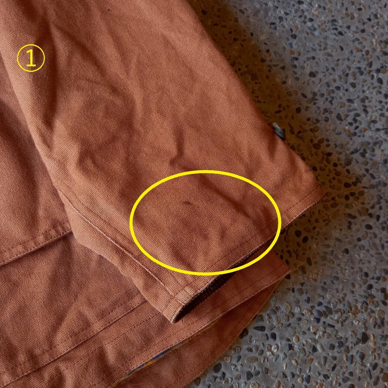 ●状態:①左袖口汚れあり。②右袖口色落ちあり。③左袖内側オイル汚れあり。④左後ろ裾ダメージあり。その他細かな色落ちあり。