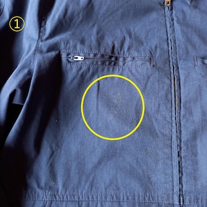 ●状態:細かい汚れあり。①右胸ポケット付近汚れあり。②左前身頃油汚れあり。③右前肩付近ほつれあり。