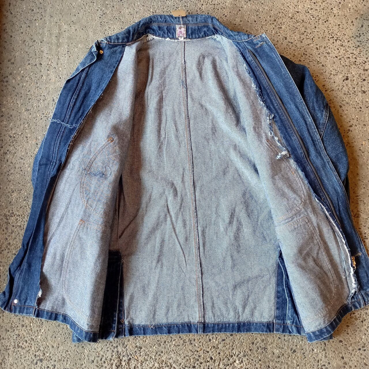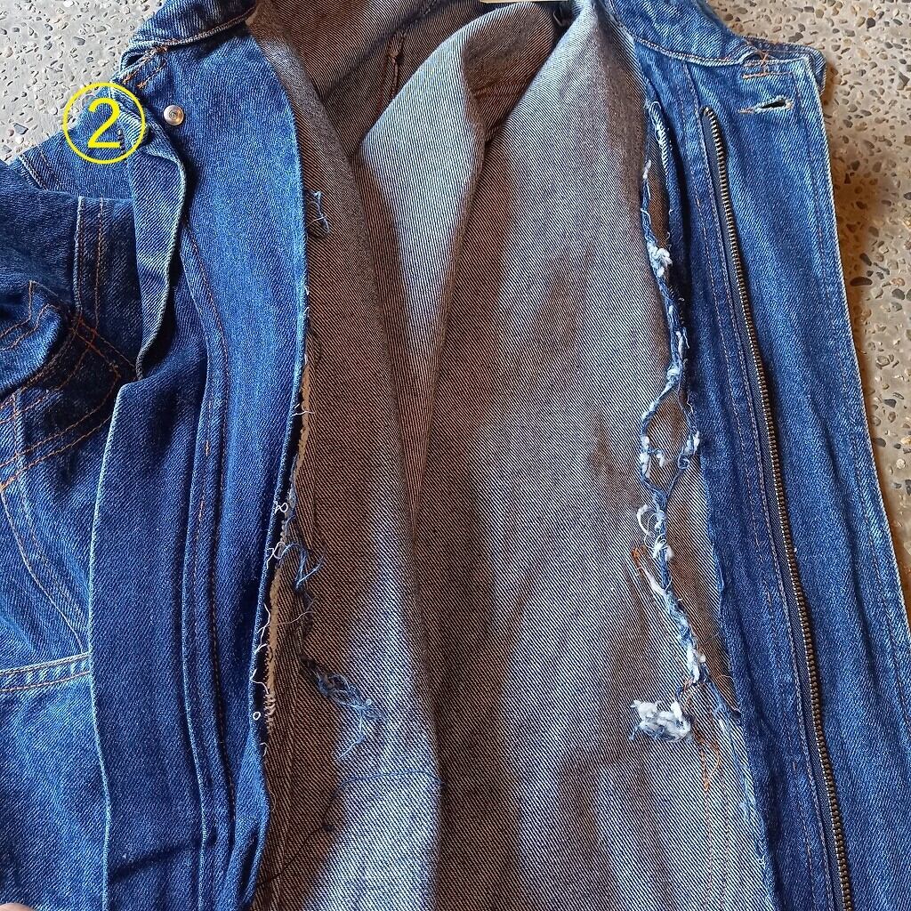●状態:前面の打ち込みボタン付きフラップはフェイクです。サイドより入口あり。①袖が短く加工されています。②内側の始末部分ほどけあり。服自体にダメージはありません。