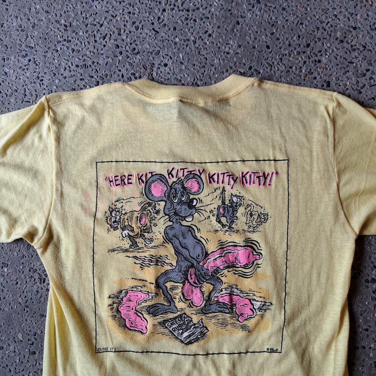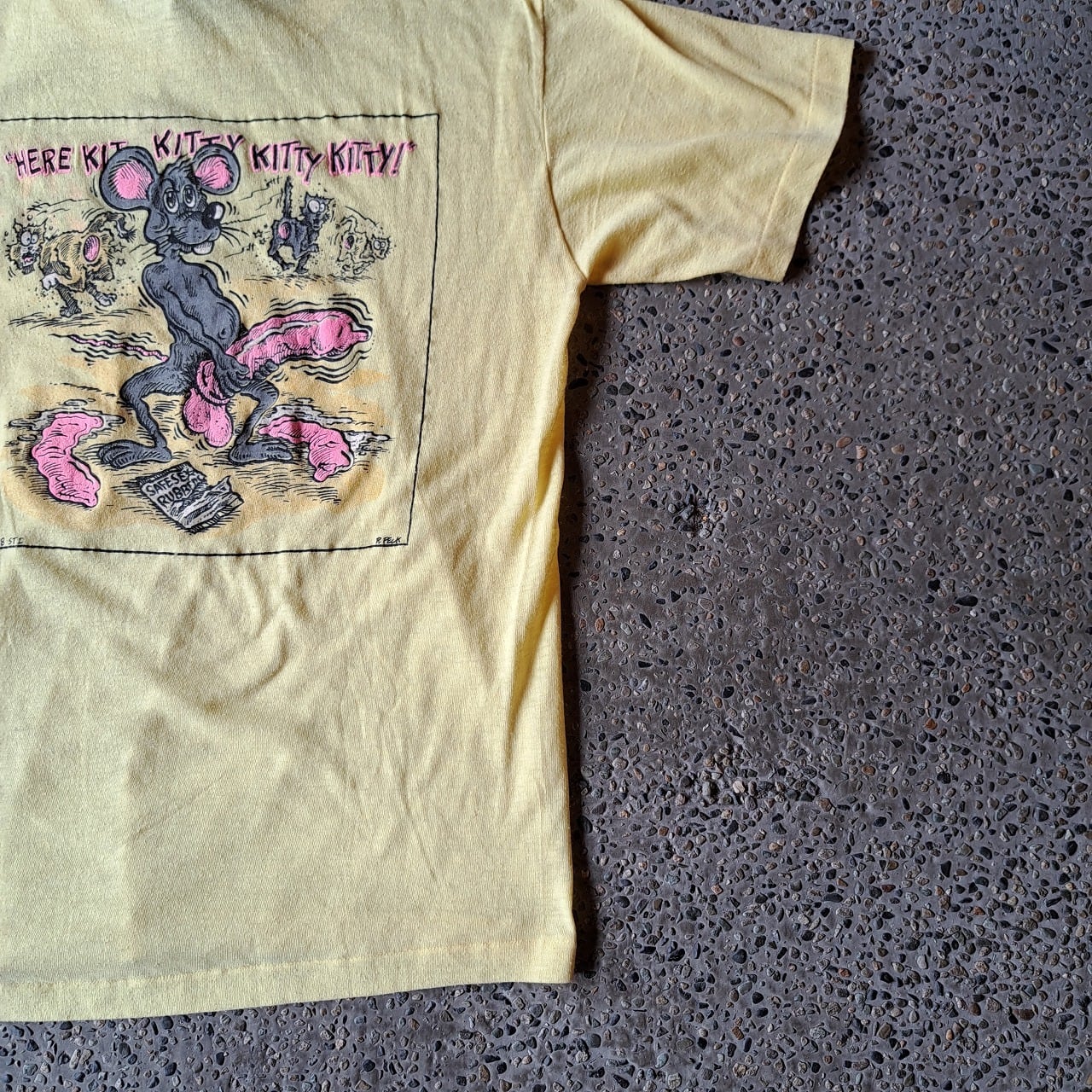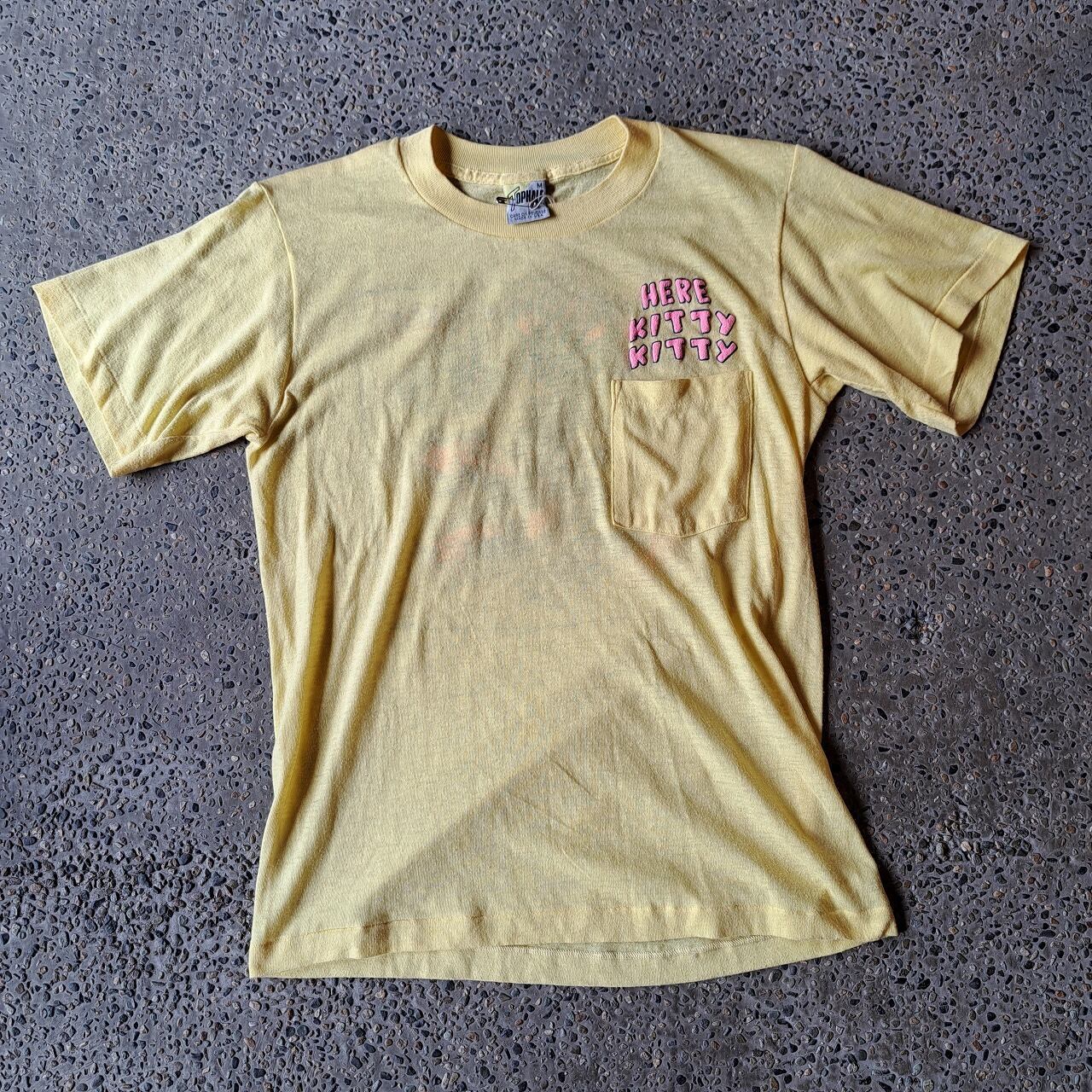 "HERE KITTY KITTY" アメリカ製 フロッキー 両面プリントTシャツ used [208020]