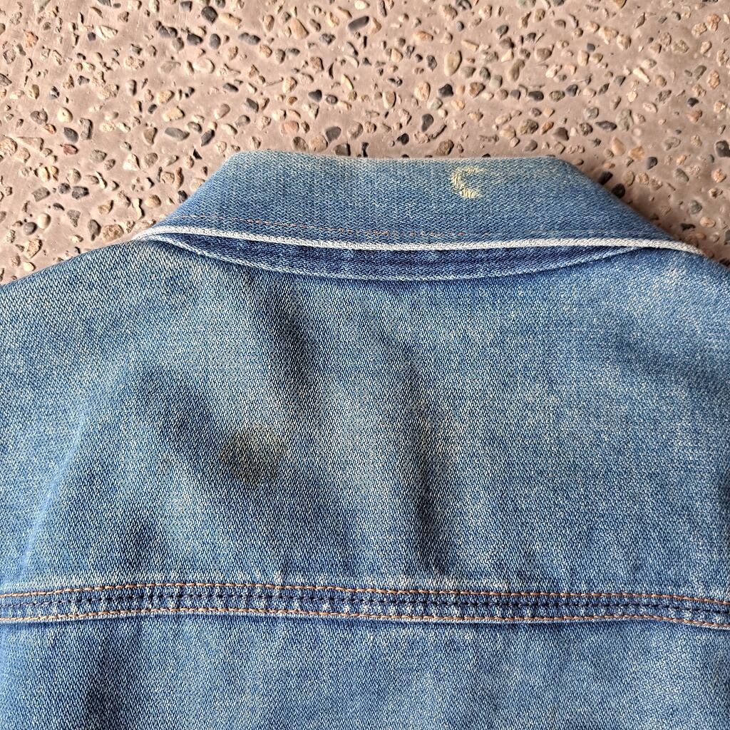 ●状態:デニム特有のシミ、色抜けあり。①両袖ダメージあり。