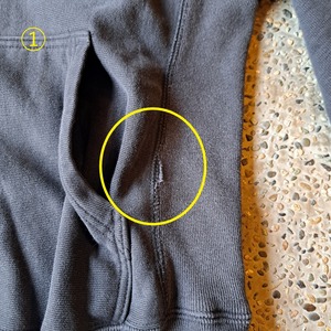 ●状態:①左脇ほつれあり。中まで穴は開いてません。②右袖口色抜けあり。③左肩付近色抜けあり。④右肩色抜けあり。