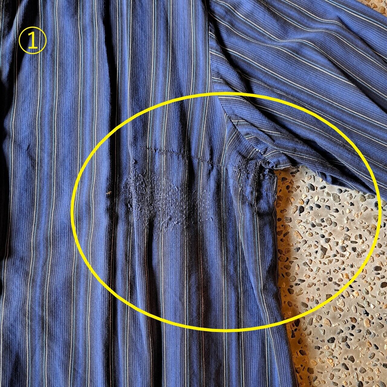 ●状態:①左脇リペアあり。②右袖口ボタン欠損。③右脇リペア、擦れ等あり。④一番下のボタン付近リペアあり。その他、細かいダメージあり。着用は問題ありません。