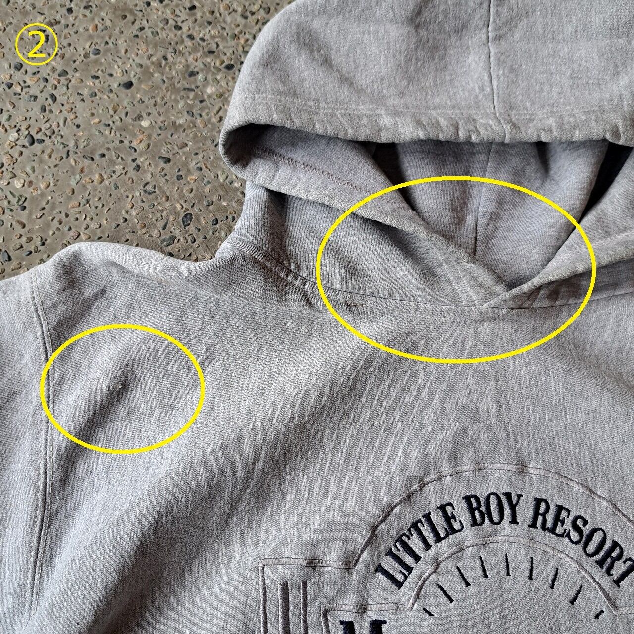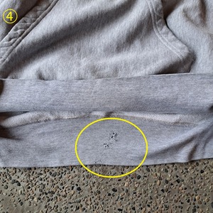 ●状態:①前身頃汚れあり。②右肩付近ダメージあり。首元擦れあり。③左後ろ身頃ダメージあり。④後ろ裾リブ内側ダメージあり。